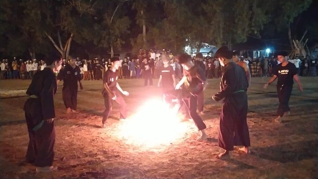 Nampak para santri yang tergabung dalam Pencak Silat Nahdlatul Ulama atau Pagar Nusa PAC Kedungdung Sampang begitu bahagia memaikan bola api bersama sejumlah santri PP. Assirojiyyah Kajuk.